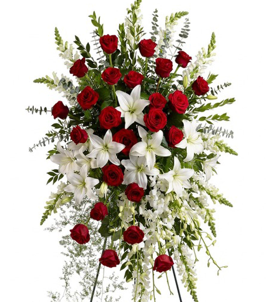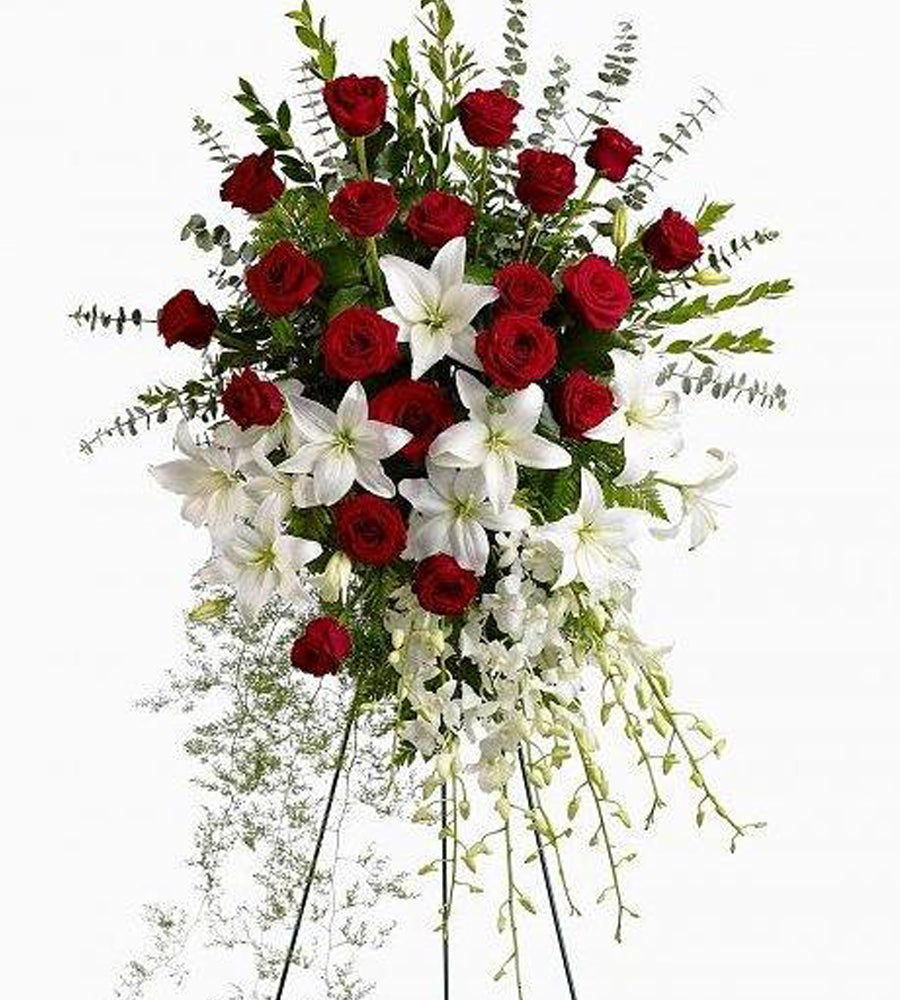 Lily & Rose Standing Spray is an elegant display of red roses and white lilies to honor your loved one.