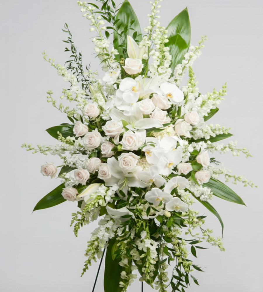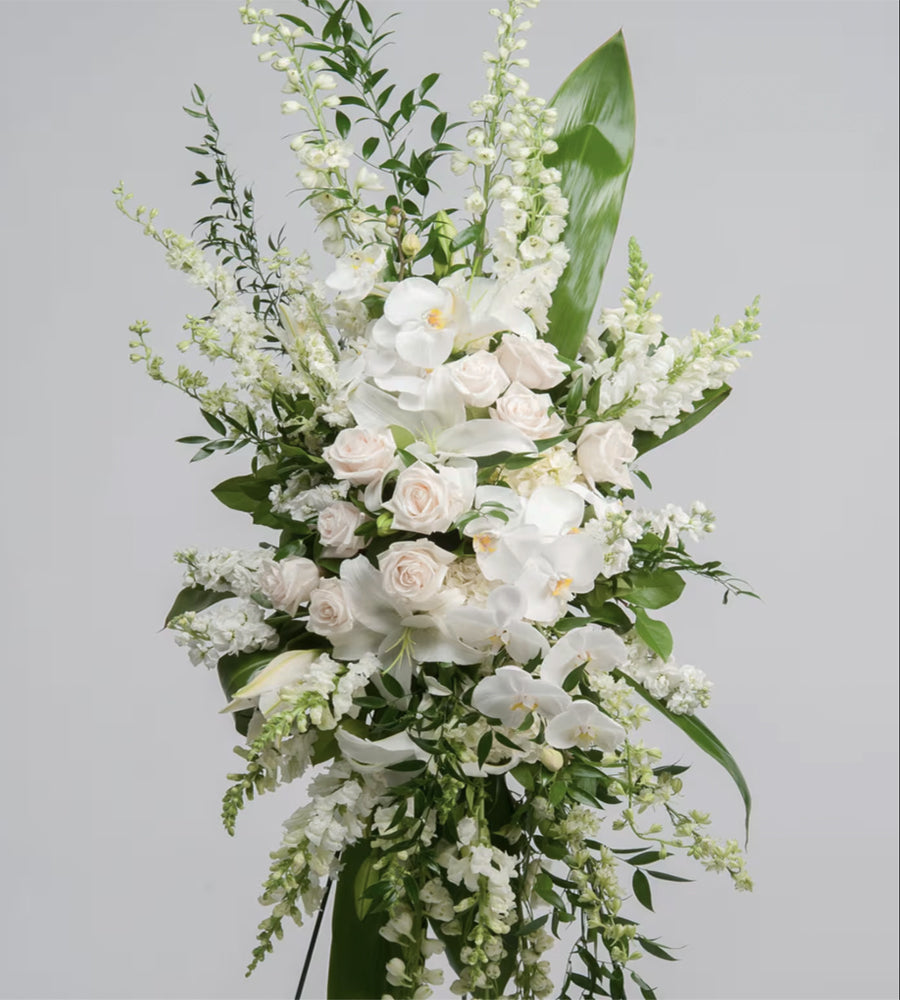 White and cream orchid spray featuring elegant phalanopsis orchids, roses, and snapdragons with lush greenery. Perfect sympathy flowers for memorial services and funeral arrangements. This stunning funeral flower spray arrives on a wire easel with a satin ribbon accent, creating a dignified display to honor and celebrate a loved one's life. Ideal for viewings, services, and graveside tributes.