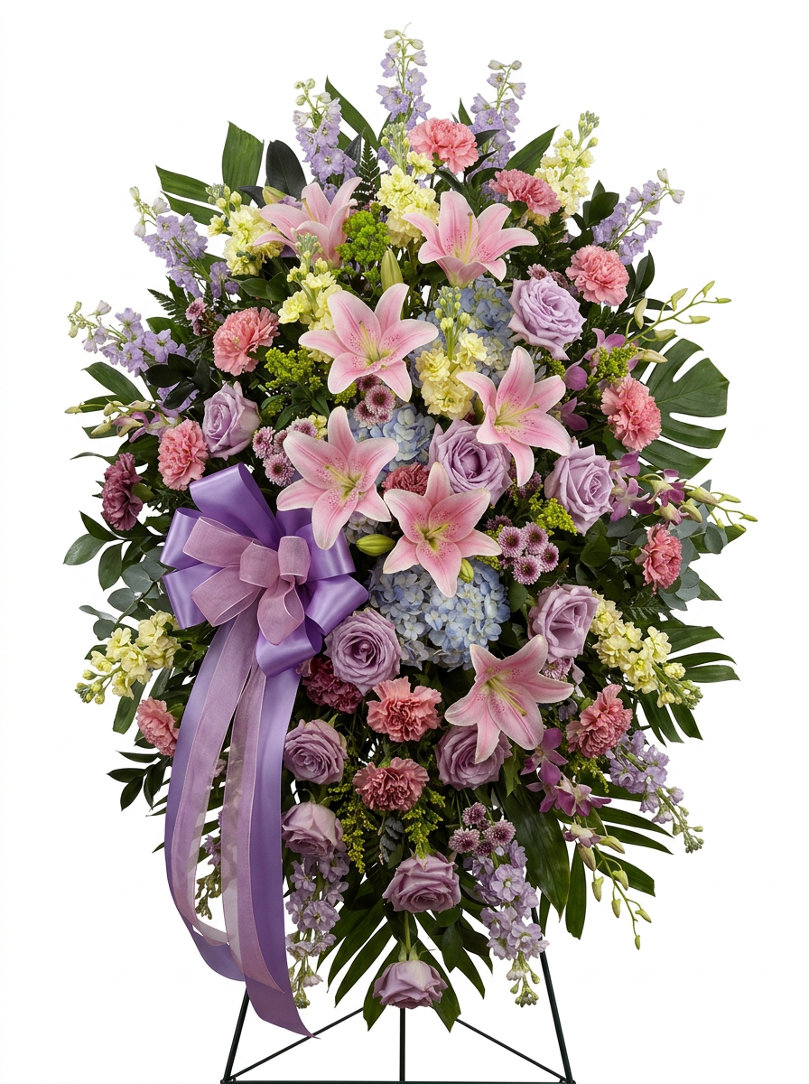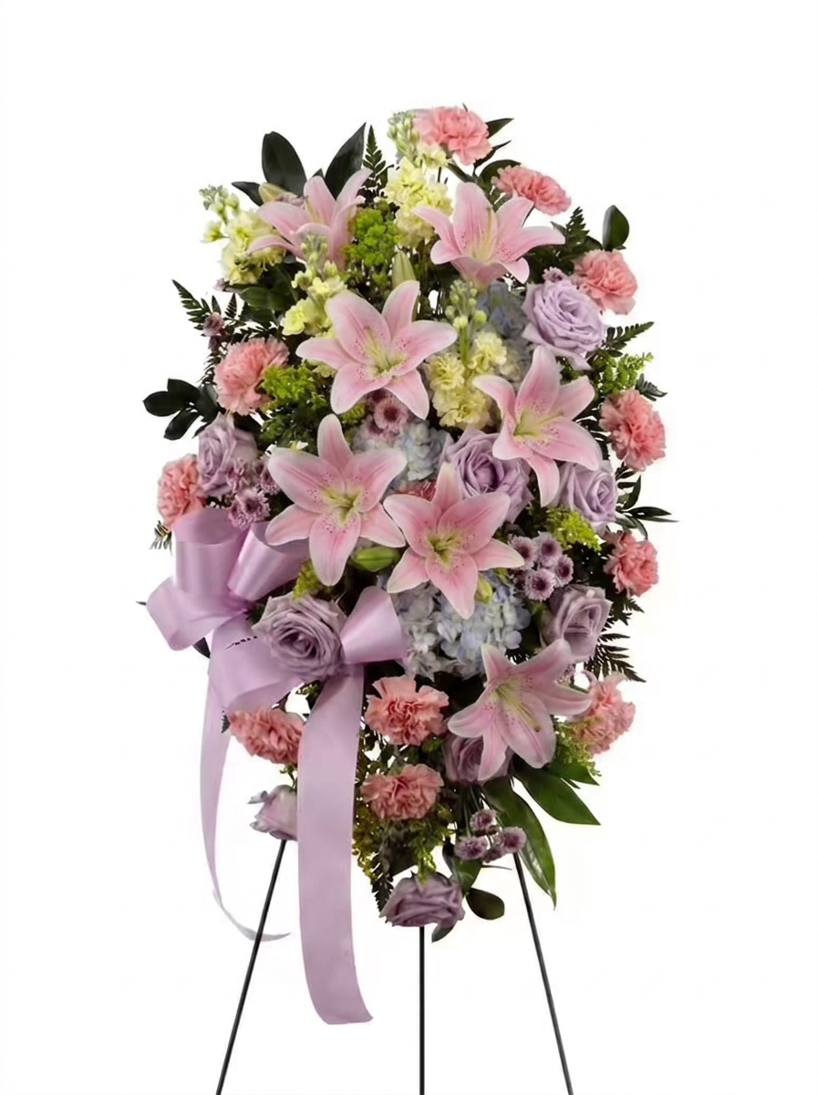 Express your deepest condolences with our Pink Lily Standing Spray, a thoughtful sympathy flower arrangement designed for funeral services. This elegant standing spray features soft pink Asiatic lilies, lavender roses, pink carnations, hydrangea, stock, and lavender button poms, complemented by lush greenery and a lavender satin ribbon. Displayed on a sturdy wire easel, this funeral flower delivery arrives ready to honor and celebrate a cherished life. Perfect for viewings, memorial services, or graveside tributes. Approximately 36"H x 20"W. Trust Georgewood Florist for compassionate sympathy flowers delivered with care.