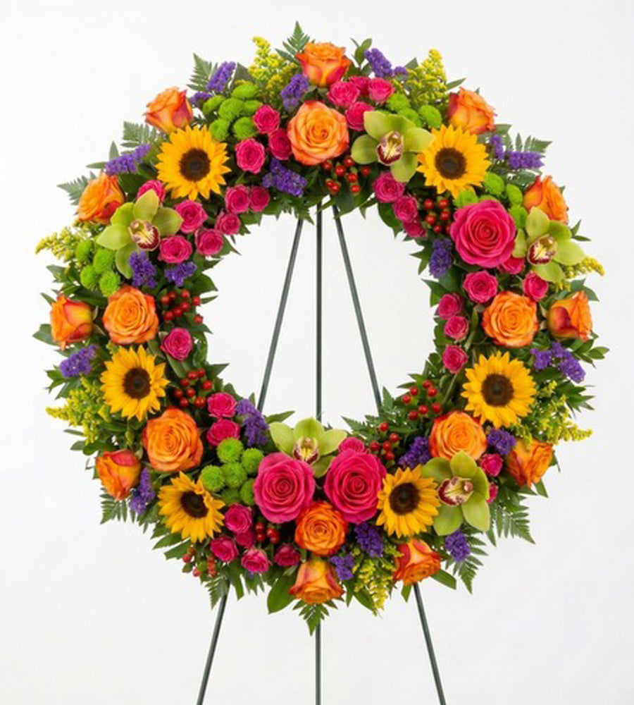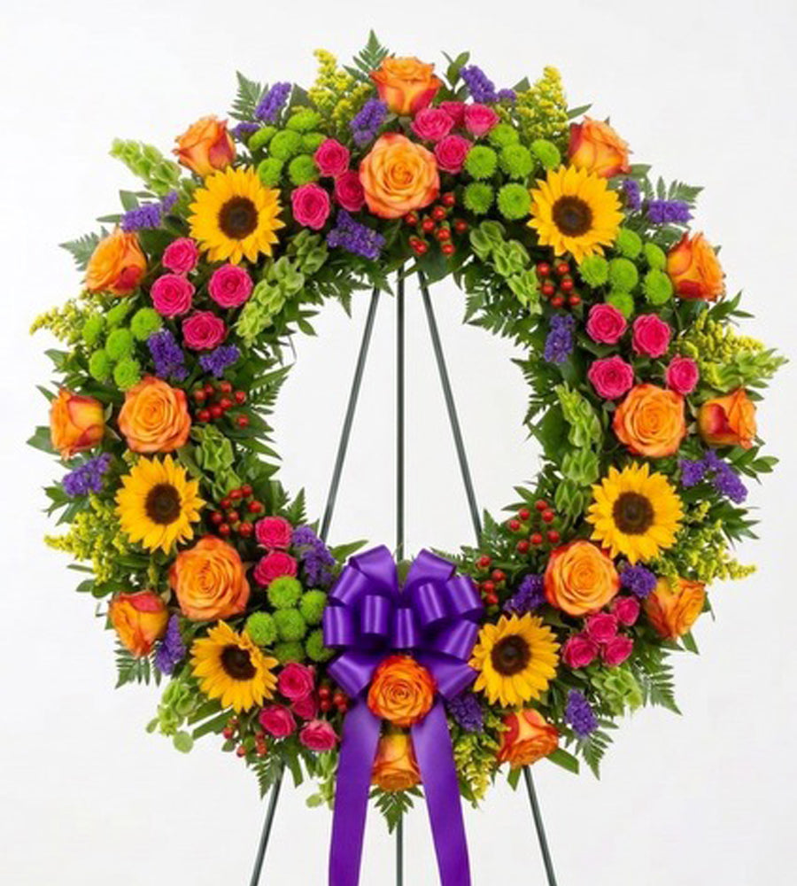 Sunshine Tranquility Wreath brings peaceful elegance to memorial services in Floral Park, NY and surrounding areas. This stunning arrangement features vibrant sunflowers and roses, radiating warmth and comfort during times of remembrance. Perfect for funerals and celebrations of life, each wreath arrives beautifully displayed on an easel, ready for immediate presentation.