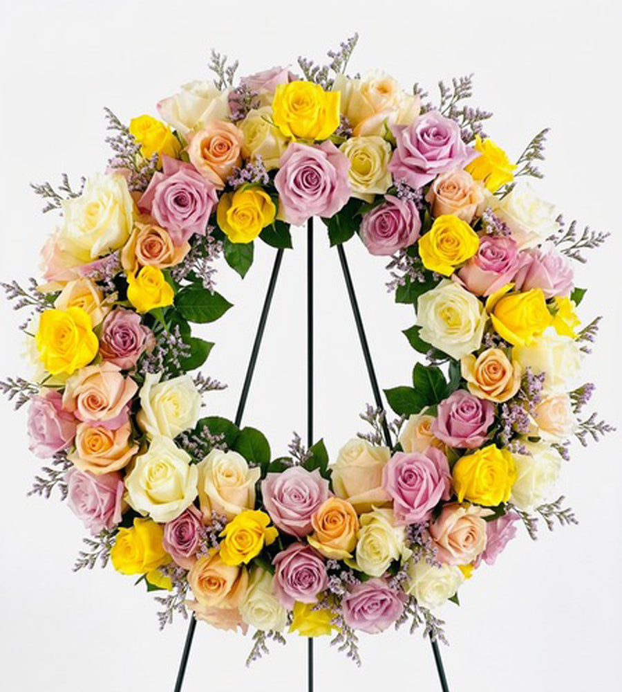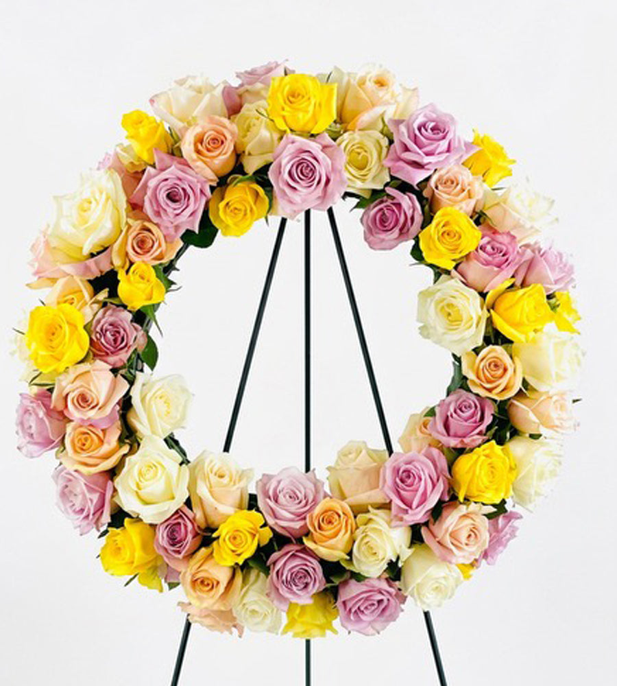 Pastel Rose Wreath is serene gesture with a bounty of pastel roses, complimentary greens and a ribbon. Appropriate for the funeral service, this arrangement is delivered and displayed on an easel.