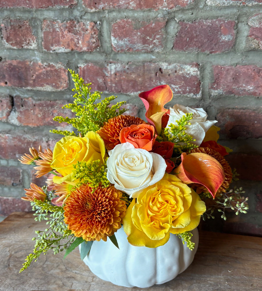 Pumpkin Harvest is a bountiful arrangement of roses, calla lilies, spray roses, mums, and eucalyptus, arranged in a white ceramic pumpkin with lid.